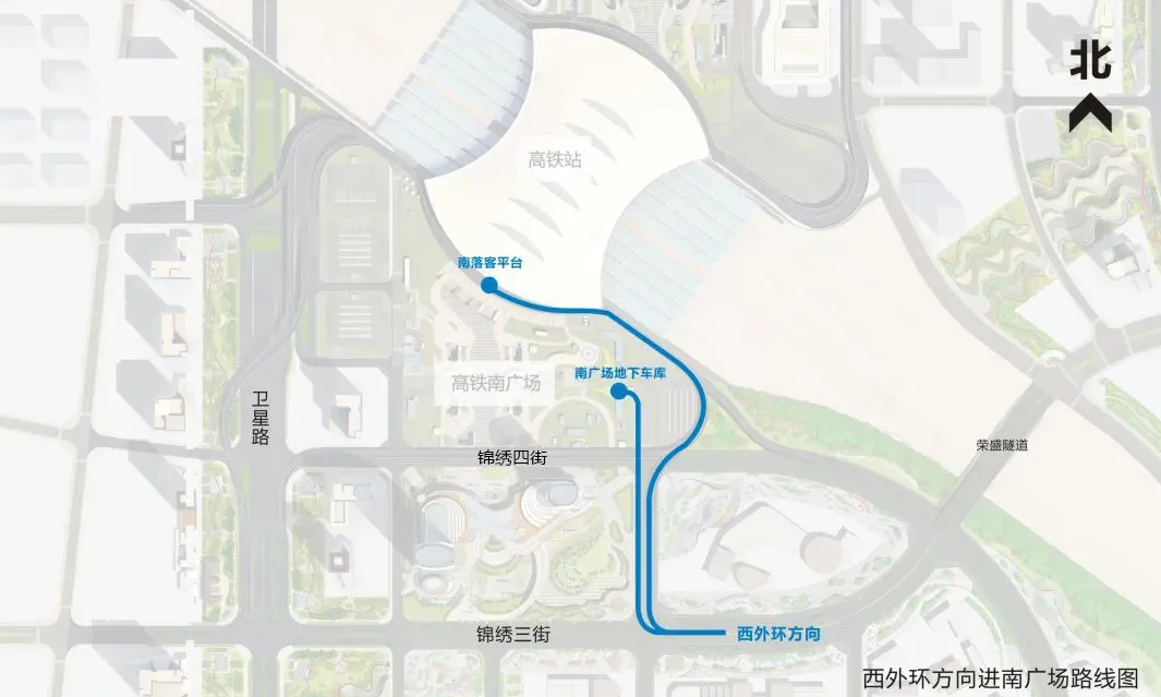 西外环方向的车辆可以穿过荣盛隧道隧道,出隧道后右转驶入南落客平台直接送客,有停车需求的车辆出隧道右转经过高铁南三路进入南广场地下车库。