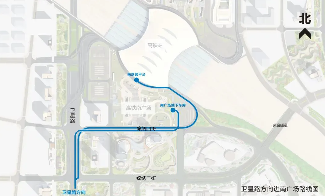 卫星路方向的车辆可以从卫星路匝道上桥直接进入南落客平台送客,有停车需求的车辆经过锦绣四街,在与高铁南三路交叉路口左转进入南广场地下车库。